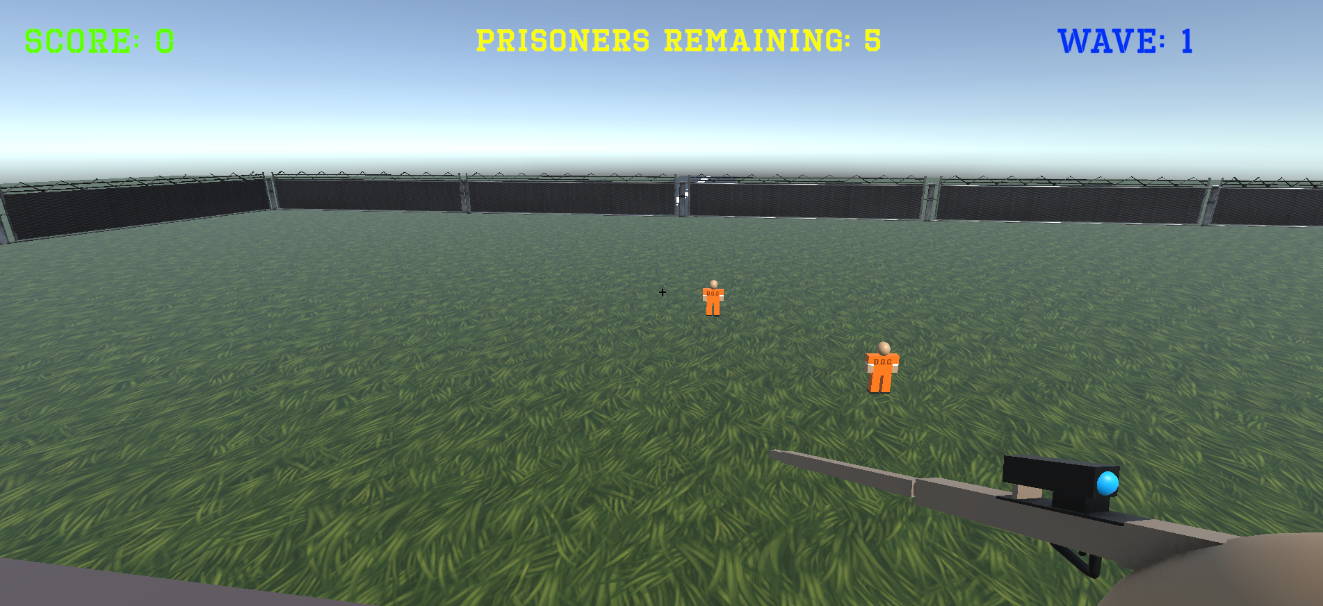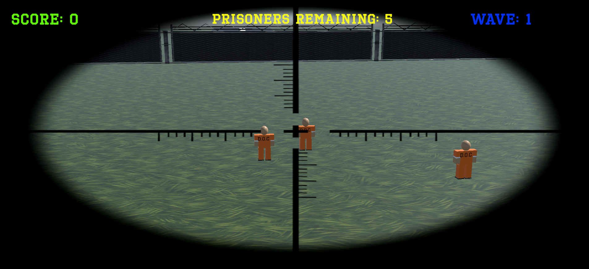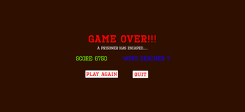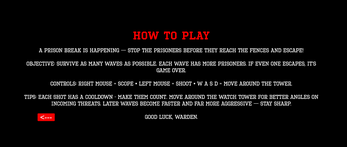 A prison break is happening , your job as the warden is to stop the prisoners before they reach the fences and escape! Survive as many waves as possible. Each wave has more prisoners. If even one escapes, it's Game Over. Aim for the head!! Headshots are worth 100 points, a body shot is worth 50 points, and a leg shot is worth NOTHING. Each shot has a cooldown so make everyone count. Move around the watch tower for better angles on incoming threats. Later waves become faster and far more aggressive so stay sharp and vigilent.